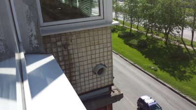 Горячий воздух выбрасывает на улицу, за ним дыра круглая на 100мм и шланг длинной 20см проходит в нее. Могу вечерком фотку скинуть.