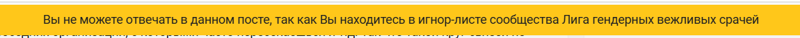 Как интересно) Хотела написать что-то приятно-ободряющее человеку в посте про отношения, а мне выскакивает сообщение "Вы не можете отвечать в данном посте, так как Вы находитесь в игнор-листе сообщества Лига гендерных вежливых срачей".