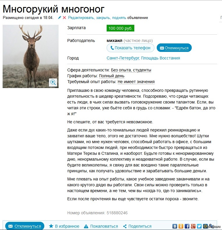 1 W1NCH3ST3R 10 лет назад Вот такая профессия Ищу на одном сайте объявлений вакансии, как на глаза попадается такой шедевр. Правда, в чём суть работы, не очень понятно, звонить и руки чешутся, и боязно) Вакансии Объявление Санкт-Петербург Креатив