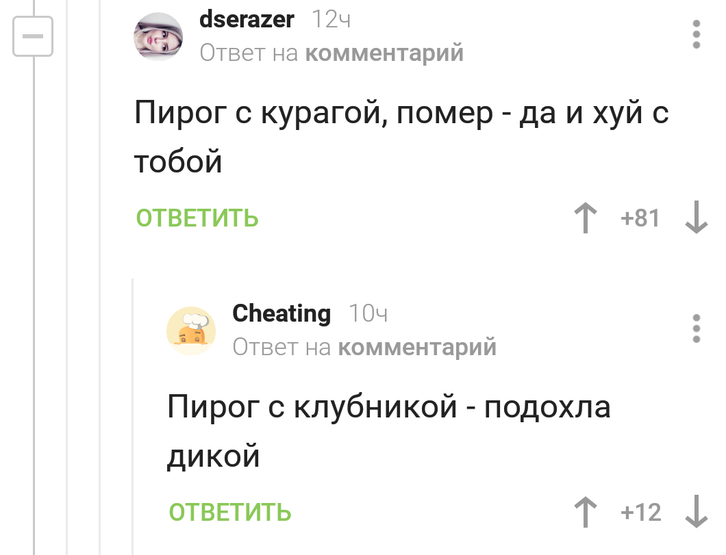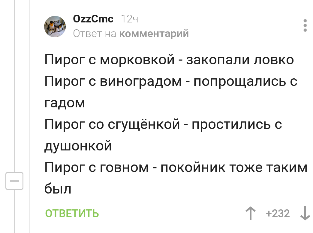 15 triumf1408 Вот такие пироги 6 лет назад Конкурс на лучшую рифму продолжается. https://pikabu.ru/story/vot_takie_pirogi_6824971 Поминки Вот так вот Комментарии на Пикабу Длиннопост Скриншот