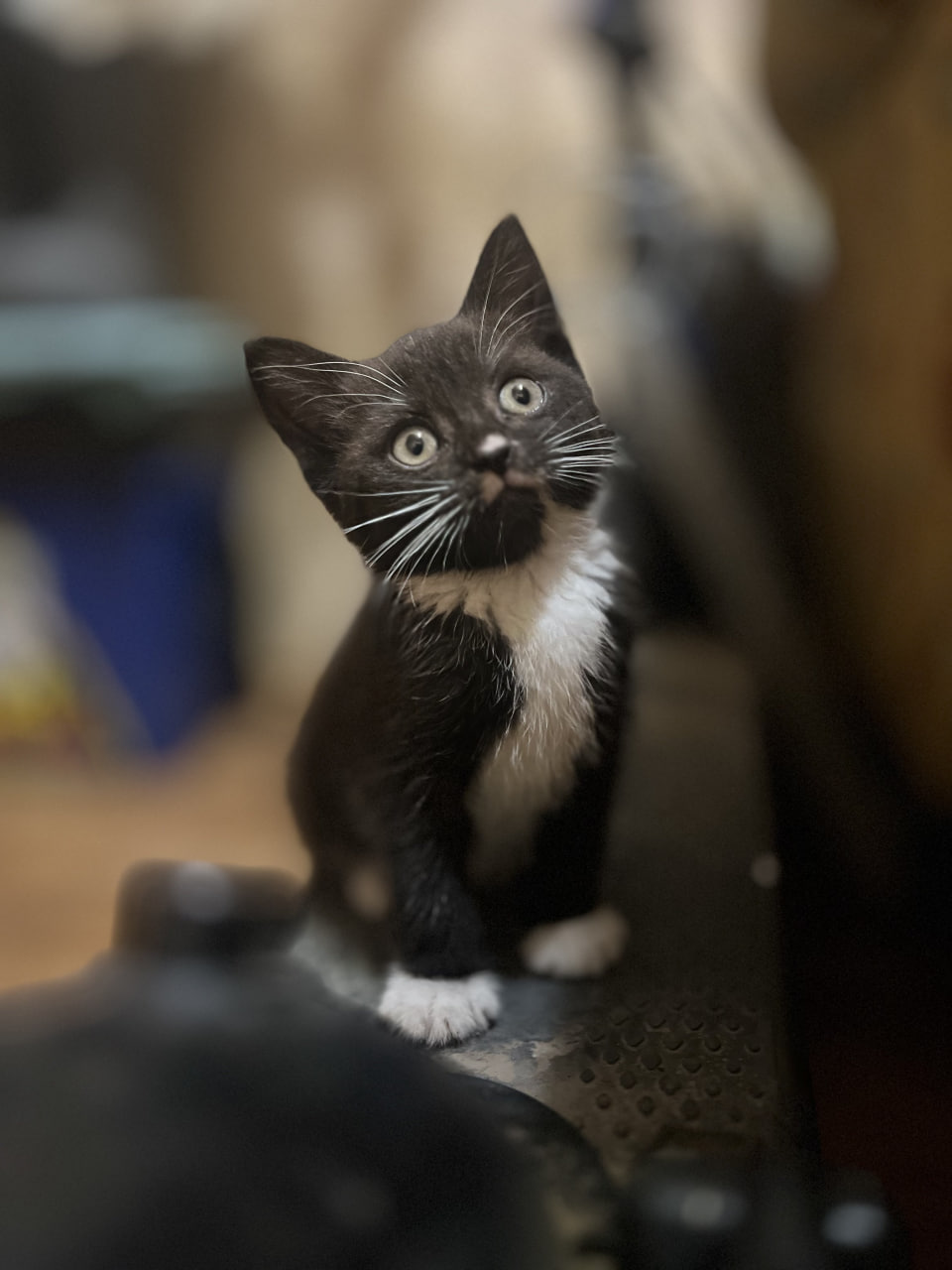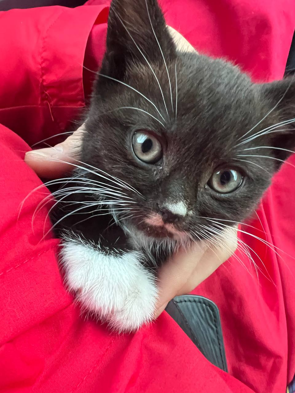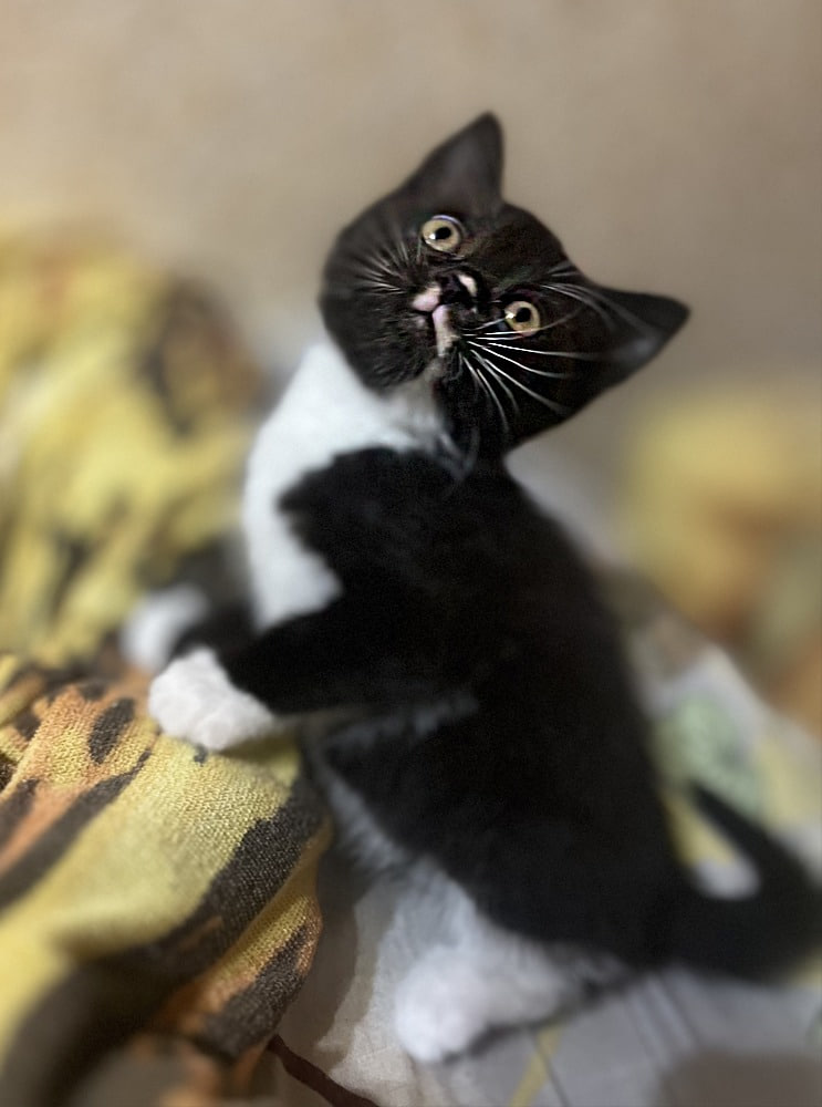 Козявка взялась непонятно откуда, растерянно оглядываясь на дороге около строящегося здания. Размером с ладошку, или чуть меньше. Это если измерять вместе с головой, лапами и хвостом. Чёрная, с белыми пятнышками и странными, не котёнковыми глазами. На улице ей было не место и вот мы уже ехали домой, она лежала у меня на коленях, молчала и только смотрела своими странными глазами.
