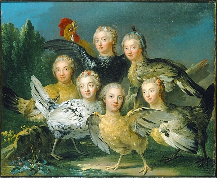 Название картины «Hönstavlan» шведского художника Юхана Паша обычно переводят как "Живописные куры", иногда «Фрейлины в ожидании королевы Ульрики». Юхан Паш считался мастером аллегорий, но сравнение с курами обычно не самое лестное для женщин. Заказчик никого обидеть не собирался и изображен там же в виде петуха. Известный политический деятель Карл Густав Тессин заказал картину в 1747 году в качестве рождественского подарка себе любимому и не собирался ее демонстрировать публично. Лица девушек были списаны с пастельных портретов, созданных Густавом Линдбергом для одной из галерей. Есть версия, что столь странный заказ был связан с тайным пристрастием Тессина - он любил подглядывать за женщинами и даже сам по секрету рассказывал, что однажды ему удалось потихоньку открыть дверь ванной, чтобы увидеть некую принцессу Рохану. В другой раз он сумел подсмотреть, как переодеваются фрейлины и решил таким образом увековечить этот волнующий для него момент. К картине он добавил стихи, в которых сравнил девушек с цыплятами, а себя с веселым петухом. Заказом политик остался доволен, а автор через год стал придворным художником.
