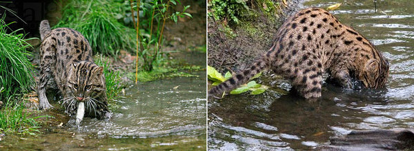 Коты-рыболовы – достаточно крупные животные: размером с собаку, около 40 сантиметров в холке, весом до 15 кг (самки меньше, около 7 кг). Длина туловища – около метра. Подтянутые и мускулистые, они обладают грацией и стремительностью леопарда и большой силой. Морда у них короткая и широкая, что придает еще больше внушительности. Уши маленькие и круглые, прижатые к голове – демонстрируют агрессию. Челюсти очень сильные, из-за чего этих животных называют питбулями кошачьего мира. Интересно, кто бы победил в схватке?