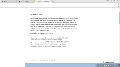 Написал в техподдержку, описав ситуацию и оставил надежду на ответ. Через день мне ответили, что это не гарантийный случай, но переговорить попробуют. Переписывались около недели и в итоге мне дают телефон коммерческого представителя в России. Созвонились, он подъехал к моему дому(!!!) и забрал сгоревшую карту, сказав, что где-то через неделю перезвонит. Перезванивает через неделю и опять подъезжает к моему дому(!!!) отдает новую(!!!) видеокарту, вот где солидность.