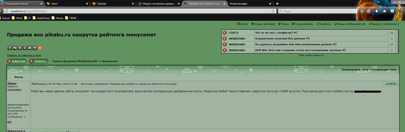 4 lydoedyshka 7 лет назад Вот это поворот. Сидишь такой и там и тут и на те...а на Пикабу бы еще пост на минусомет кармы на админах Пикабу Сисадмин Минусы Скриншот