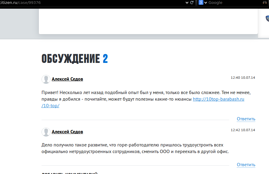 Кто то оставил комментарий к вашей жалобе на сайте. "Дело получило такое развитие, что горе-работодателю пришлось трудоустроить всех официально нетрудоустроенных сотрудников, сменить ООО и переехать в другой офис". Это правда? PS. Уже 283 голоса.