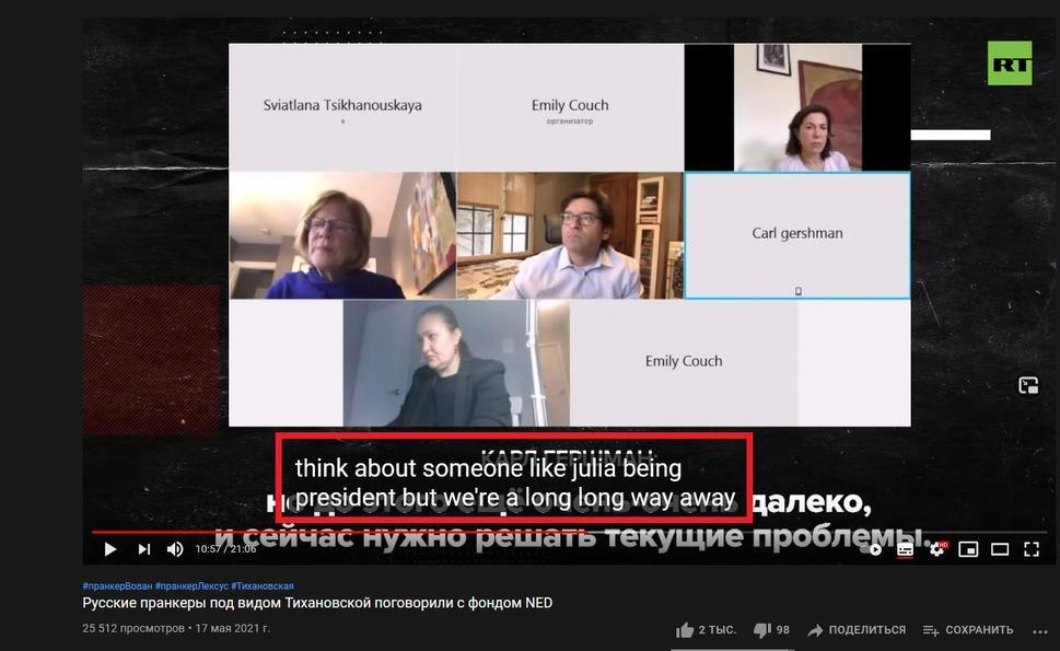 "У нас, конечно, есть большие надежды, что, возможно, в будущем мы могли бы говорить о ком-нибудь вроде ..." И в этот моменте Вован и Лексус ошиблись в переводе. Следующее слово огни поняли как YOU - ты. Но на самом деле там было Julia - Юлия. И это кардинально изменило смысл фразы. Фактически, президент NED в разговоре с Тихановской в моменте, когда они обсуждают отношения между белорусской и российской оппозицией, признался, что они очень надеются, что когда-нибудь в будущем некая Юлия станет президентом.