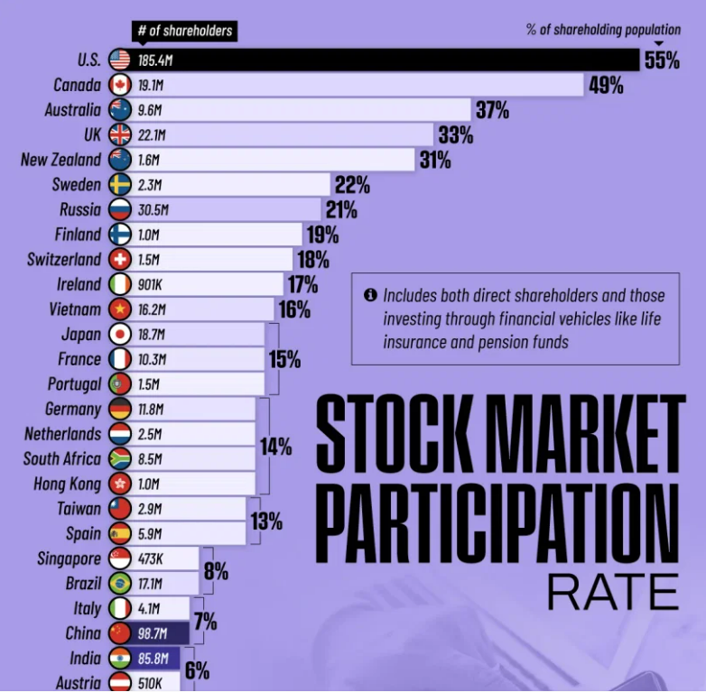 Они являются ведущей страной по объему владения фондовым рынком, за ней следует Канада (49%).