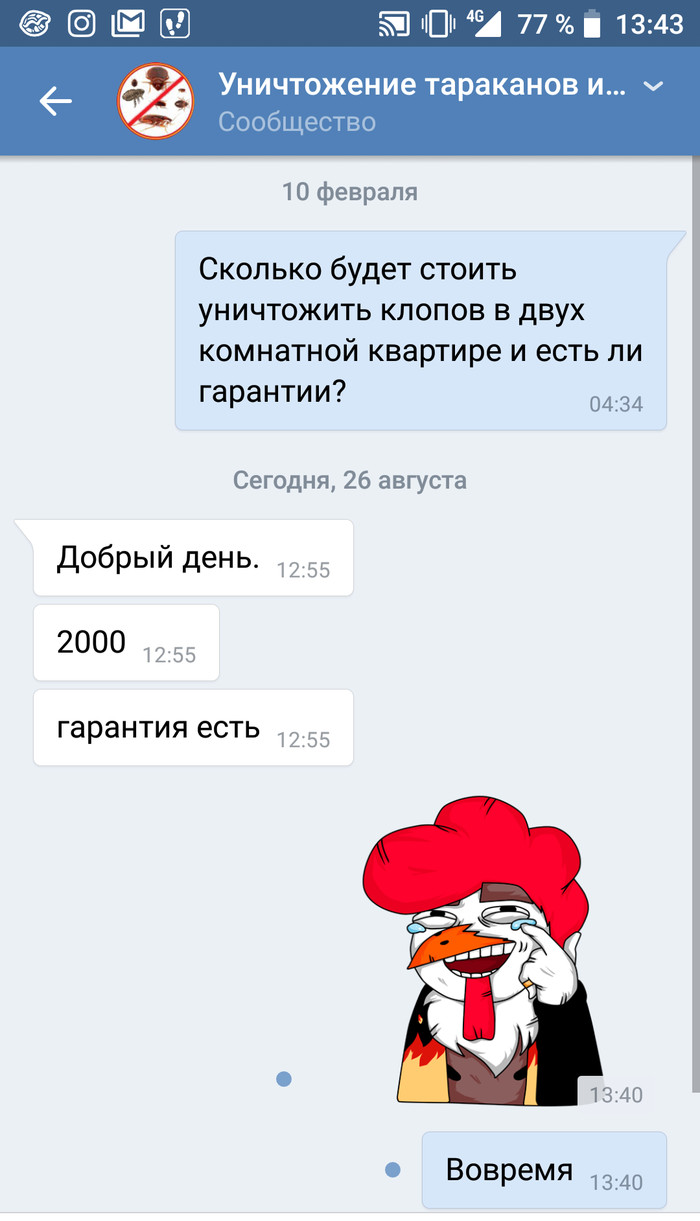 1658 DELETED Вовремя 7 лет назад Когда переехал на квартиру с общаги, обнаружил, что со мной переехали клопы и искал службу по уничтожению этих гадов, внимание на даты [моё] Клопы ВКонтакте Переписка Скриншот Диалог