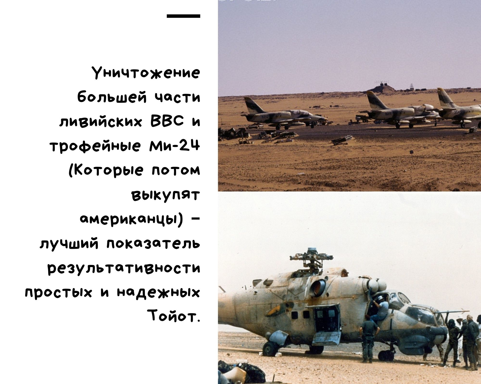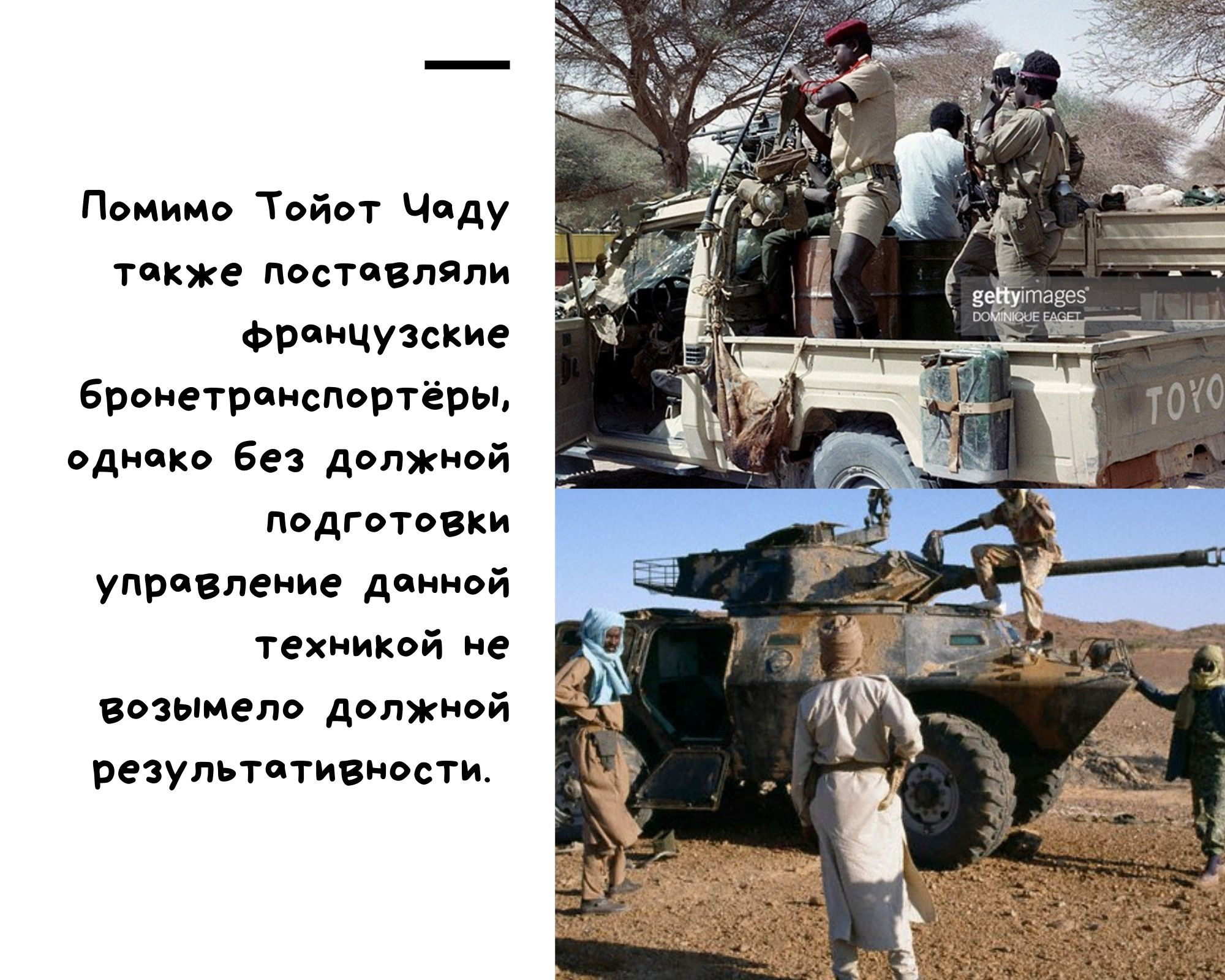 В этом же году французы предоставили правительству Чада изящную военную помощь: они обеспечили чадским войскам поддержку с воздуха и предоставили 400 пикапов Toyota Hilux, часть из которых была оснащена крупнокалиберными пулемётами, а часть ПТРК «Милан». Французы, предложившие чадским войскам такое необычное средство ведения войны, по всей видимости вдохновлялись опытом русских тачанок и мобильных групп британской SAS во времена Второй мировой войны.