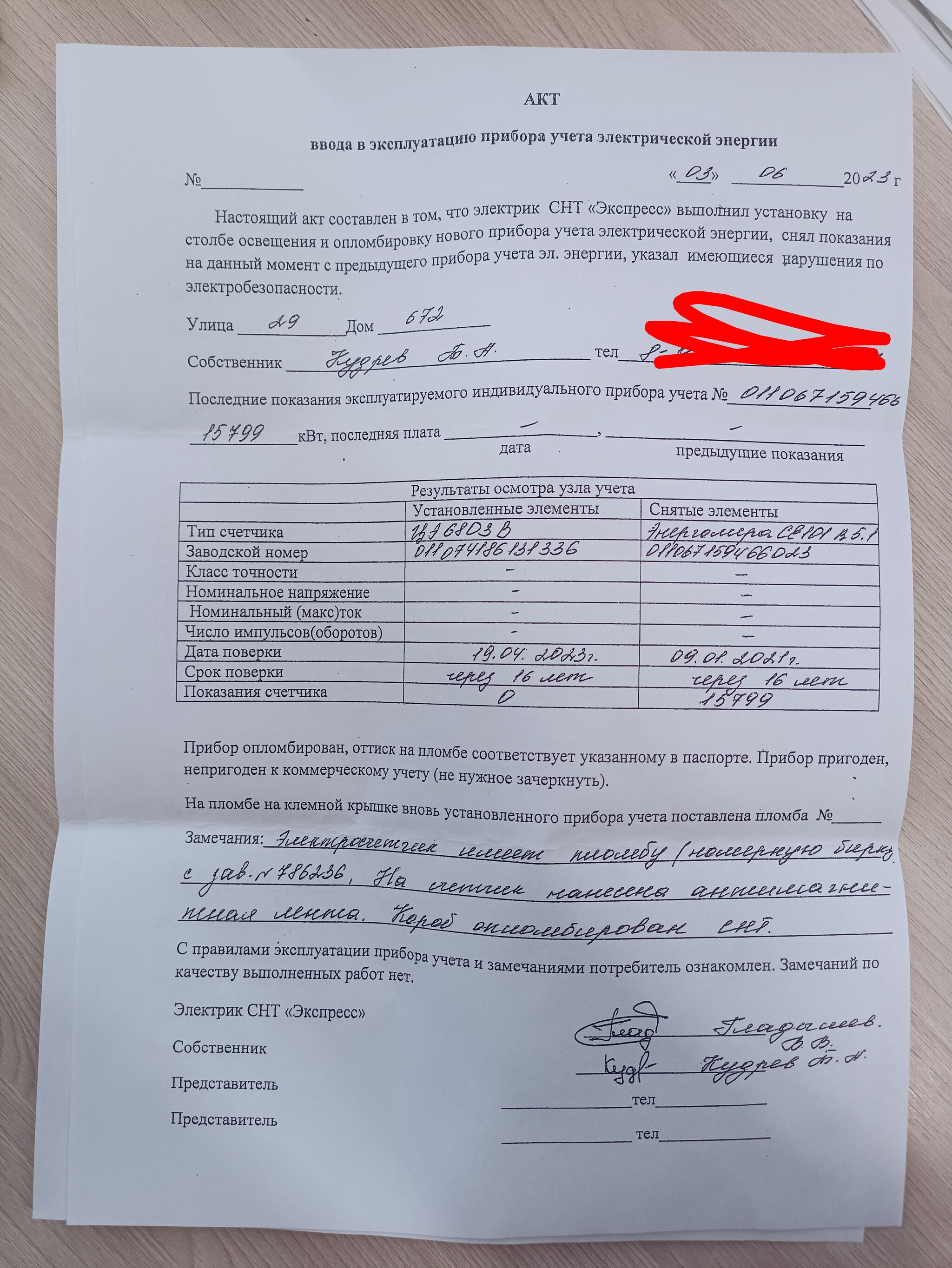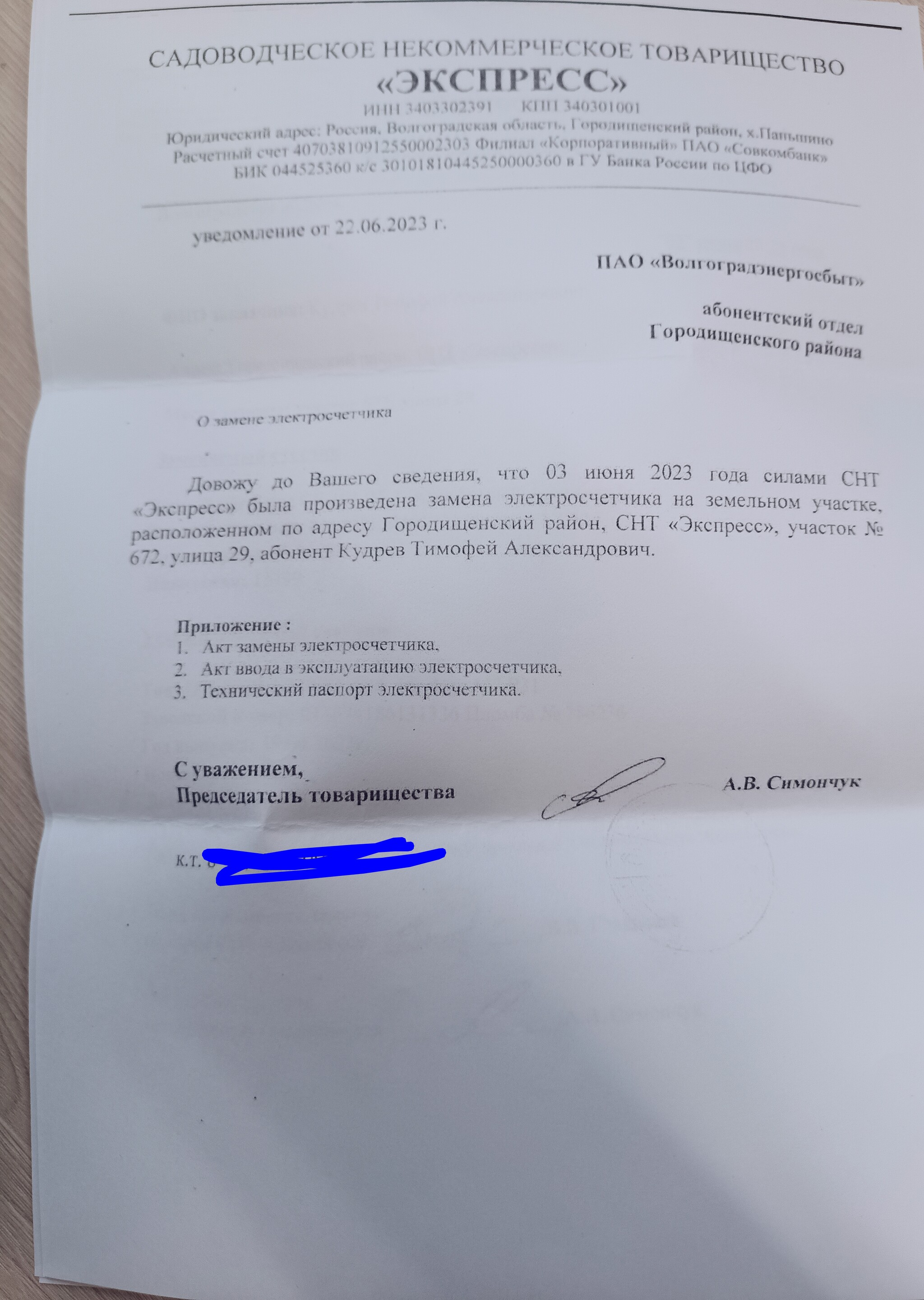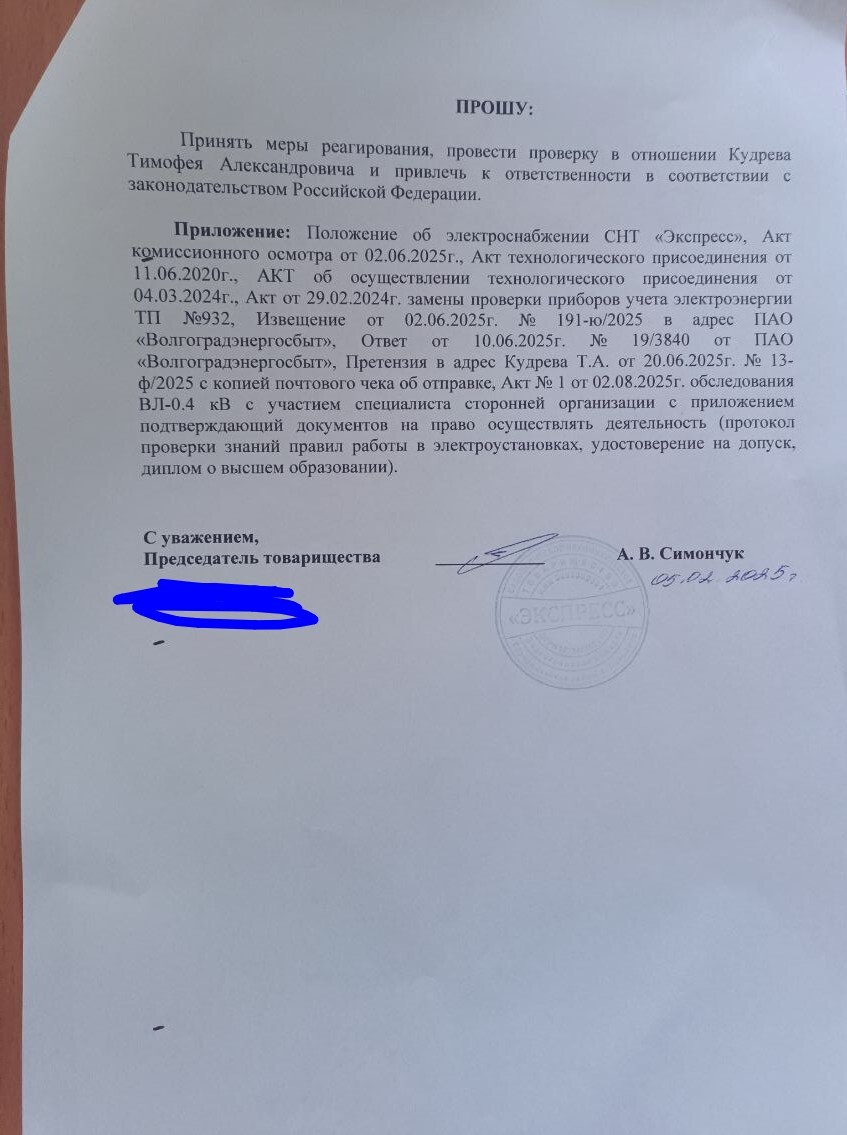 В декабре 2022 года за неделю до нового года закончив ремонт на первом этаже дачного дома, удалось переехать жить в него,продолжая делать ремонт на втором этаже. Поскольку газа в СНТ нет,был установлен котёл отопления с возможностью топки дровами, пеллетами и электричеством. Но так как выделенная на один участок мощность 5.5 кВт при одновременном включении отопления, водонагревателя и других мощных потребителей являлась недостаточной в зимний период,мною было написано заявление председателю на увеличение мощности и подключению 3 фаз. Летом 2023 года Таисия одобрила моё заявление с условием,что замена однофазной голой линии на провод СИП 4*50 до моего участка будет выполнена мною за свой счёт,и на их второй участок будут тоже подключены 3 фазы. Работы по реконструкции 90 метров линии были проведены 3 июня,мне помогал коллега и нанятая автовышка. При работах согласованных с председателем присутствовал штатный электрик,он производил необходимые отключения, приёмку приборов учёта, опломбировку. Электриком был составлен акт замены прибора учёта. И с этой даты я платил за электричество по новому трехфазному прибору учёта. До конфликта с председателем никаких вопросов к моему подключению не было. 12 августа мне позвонил участковый и пригласил на следующий день в отдел по заявлению Таисии о незаконном подключении моего участка к 3 фазам. В полицию Я предоставил имеющийся у меня акт и запросил документы у энергосбыта. 28 августа я отправил полученные документы участковому. Среди них было письмо от председателя в энергосбыт о замене у меня прибора учёта силами СНТ. Получив от меня документы полиция вынесла отказ в возбуждении дела. Вчера я забрал с почты уведомление от СНТ о уменьшении мощности моего подключения и переключению на одну фразу 5.5 кВт. Работы планируются 11 октября.