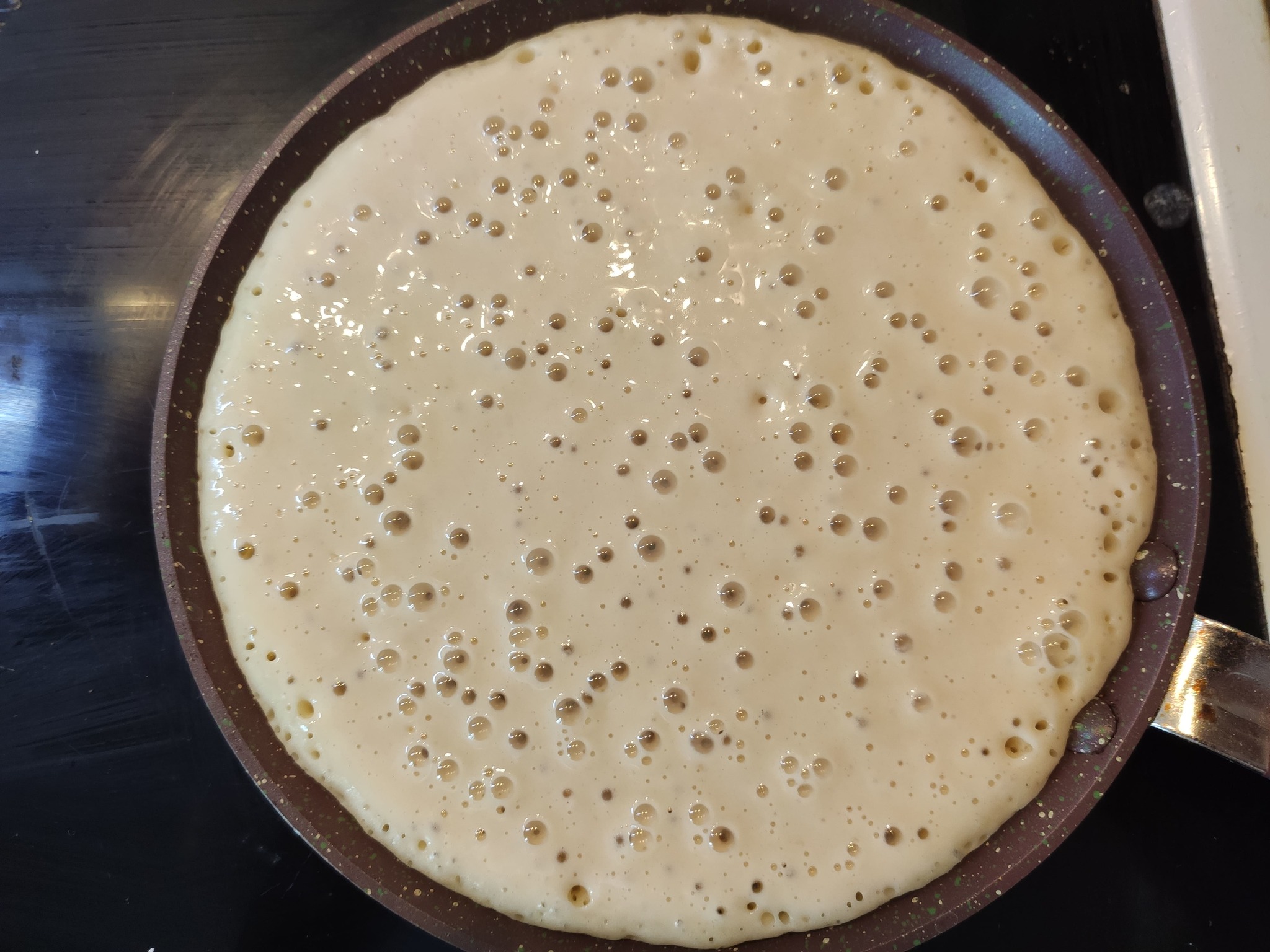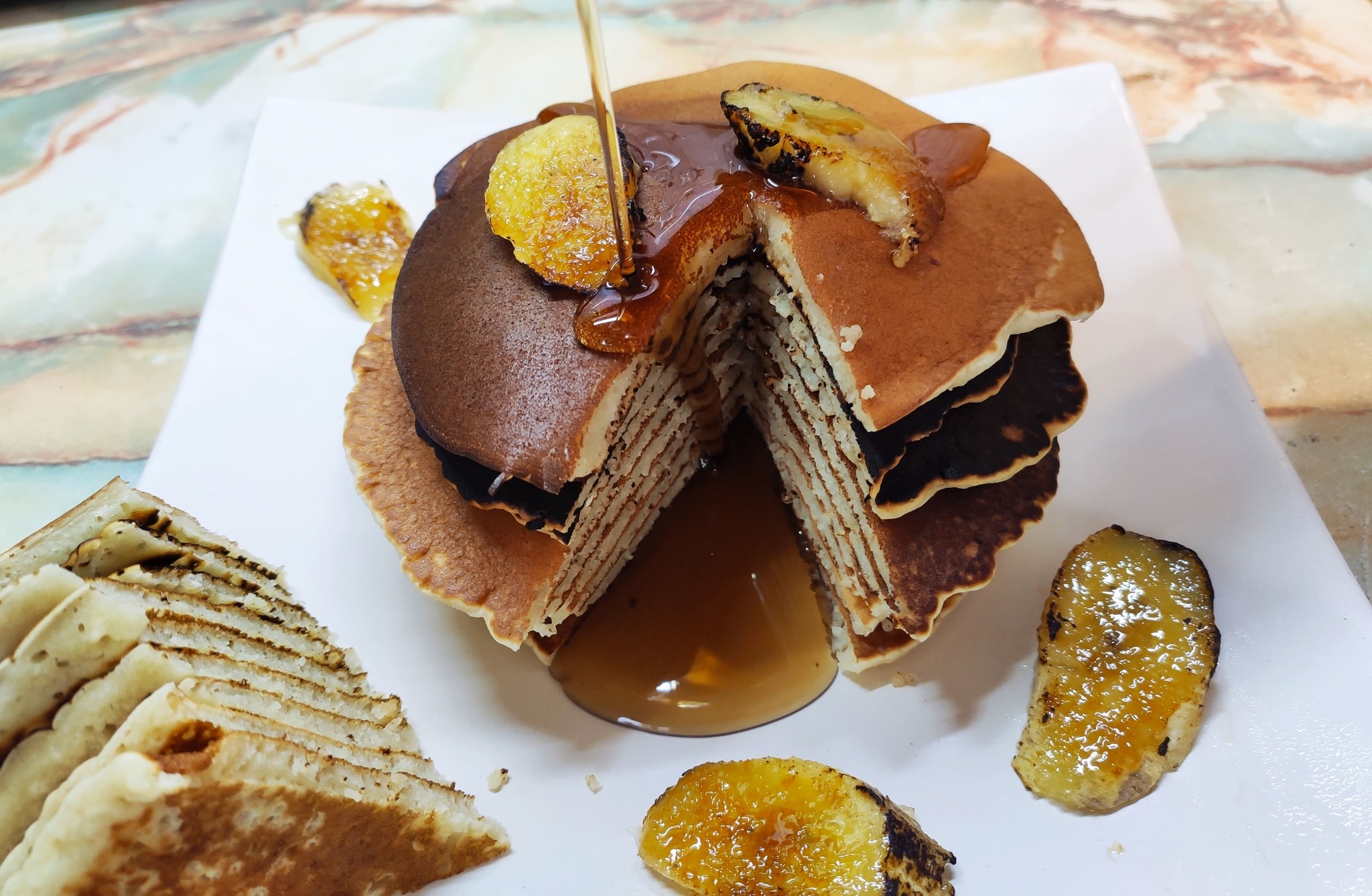 Разогреваем сковороду, на которой возможно жарить без масла. Обжариваем панкейки, когда появятся пузыри, переворачиваем. Готовые панкейки можно подавать с кленовым сиропом или карамелизированными бананами
