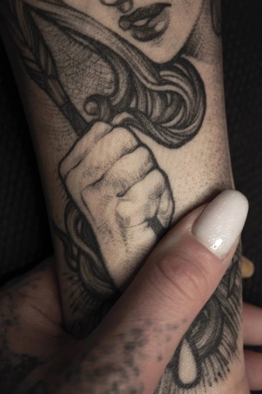 Я сразу спрашиваю, почему именно такая татуировка, хотя догадываюсь. На всякий случай уточняю, почему рука. Слушаю короткий, но до боли знакомый рассказ. Смотрю на скинутые референсы из своих же рисунков далеких лет, все как один — ровно то, что нужно: потому что я сама в те годы ровно такая же, как сейчас — Маша, и поэтому рисую кровью.