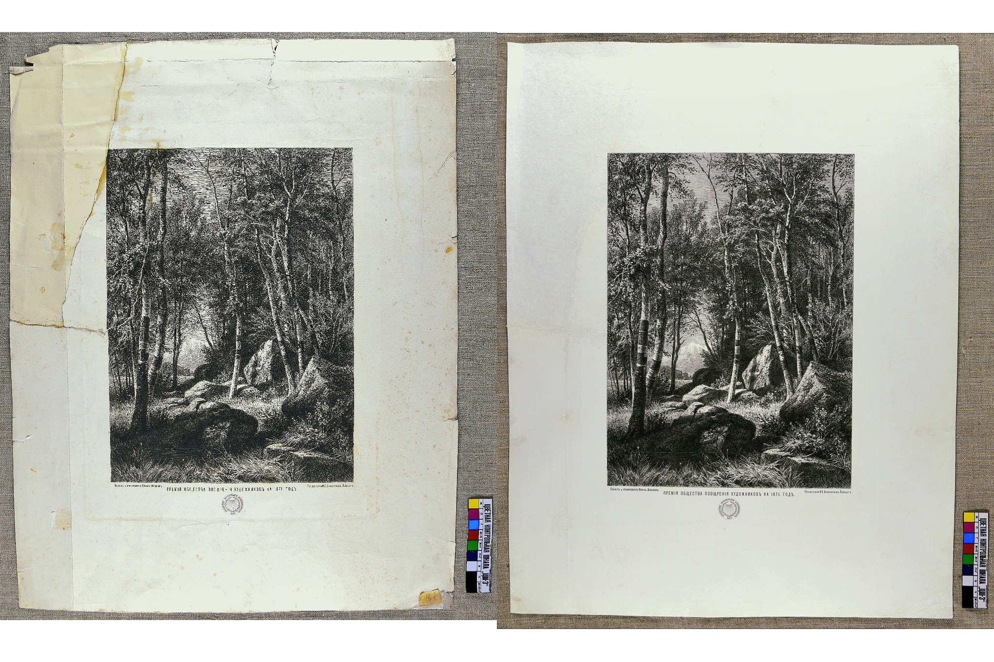 Мне в руки попал офорт авторства самого Ивана Ивановича Шишкина. Работа была большого формата и её проблемы были соответствующими. Главной из них стала полная утрата верхнего левого угла.