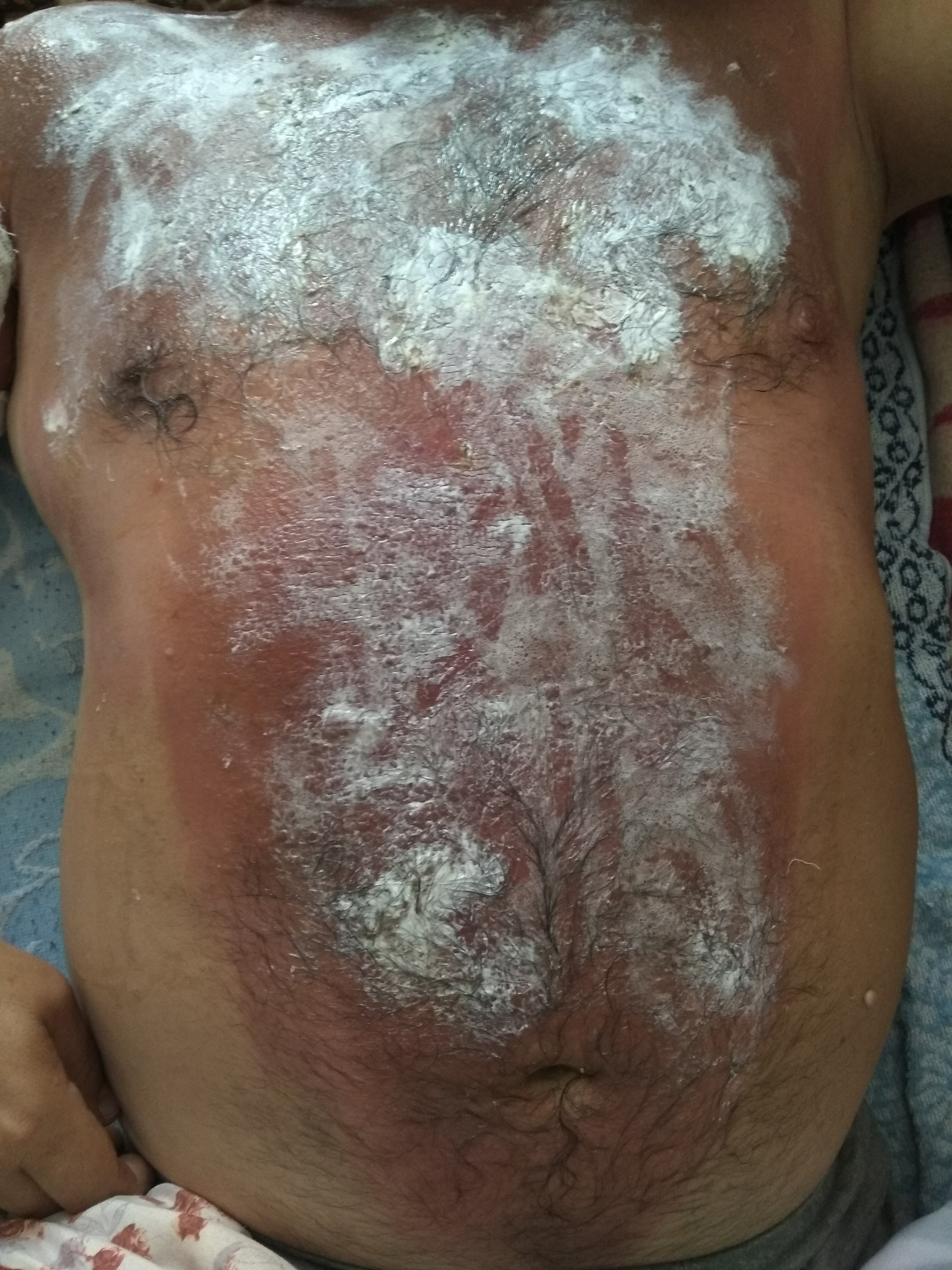 4) Пациент 55 лет. Привезли на консультацию из Туберкулезного диспансера. Со слов пациента- Проснулся утром и увидел, что все тело-руки, грудь, живот- в ожогах. Множественные пузыри. Эпидермис прям отслаивается. Откуда ожоги- пациент пояснить не может. Первая мысль- Синдром Лайелла (токсический эпидермальный некролиз) — наиболее тяжёлый вариант аллергического буллёзного дерматита