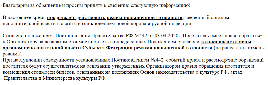 В 2019 году покупала билеты через концерт ру на французские мюзиклы "Дон Жуан" и "Ромео и Джульетта". В связи с ковидом и всеми ограничениями, они несколько раз переносились. Последняя дата для "Дон Жуана" была на 14 марта. В итоге его снова перенесли, уже на неопределенный срок. В "концерт ру" написали, что с вопросом о сдаче билета и возвращении его стоимости обращаться к организаторам. Те по электронной почте прислали следующий ответ: