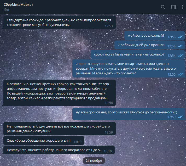 Почитал отзывы на разных ресурсах, везде одинаковая картина. Даже если вам повезло и сделали возврат, не факт что деньги вернуться к вам. Очень часто обращения вообще закрывают, оставляя их без ответа. Берегите себя, свои нервы и здоровье, не ведитесь на скидки, не покупайте на Сбер Мегамаркет.