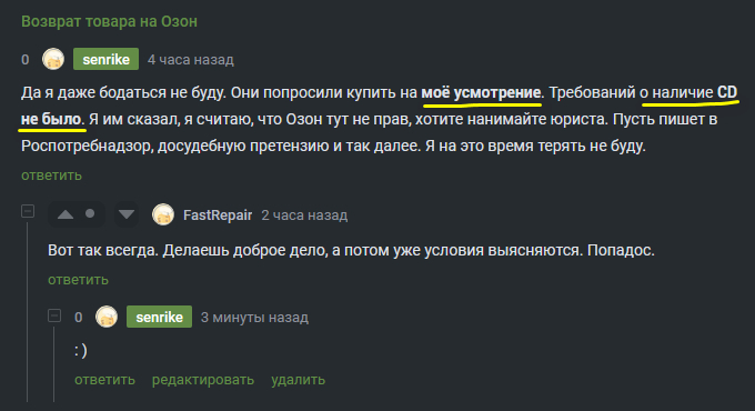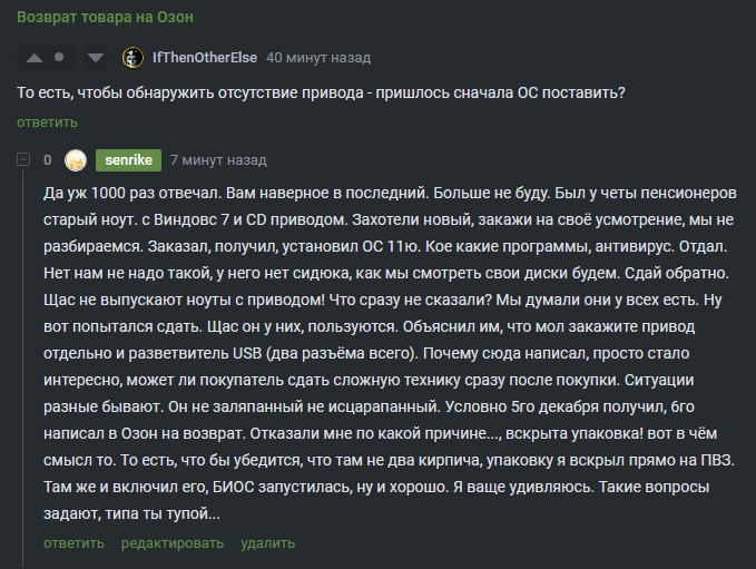 Приобрёл для пары пенсионеров ноутбук на Озоне. Они в отказ, нам не надо ноут без CD/DWD. Говорю не выпускают сейчас ноутбуки с сидюком. Нет верни обратно. А обратно не получается. Озон отвечает, раз вскрыта заводская упаковка, возврат не возможен. Сутки прошли с момента получения всего. Вот как так то?, не ожидал даже. То есть упаковку вскрыл, что бы убедится, что там не кирпич и всё... я ваша навеки.