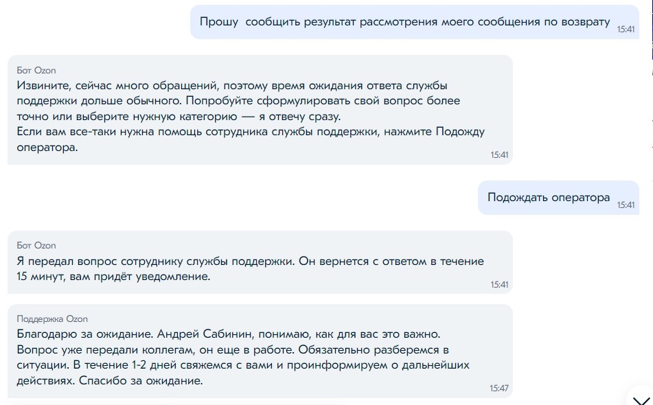 Служба поддрежки ОЗОН заслуживает отдкльного котла в аду. Более убогой организации поддержки пользователей я еще не встречал. Горячая линия не работает, общение только через сообщения на сайте, пробиться через чат бота сложно, каждый раз отвечает новый оператор и доводят совершенно разную информацию.