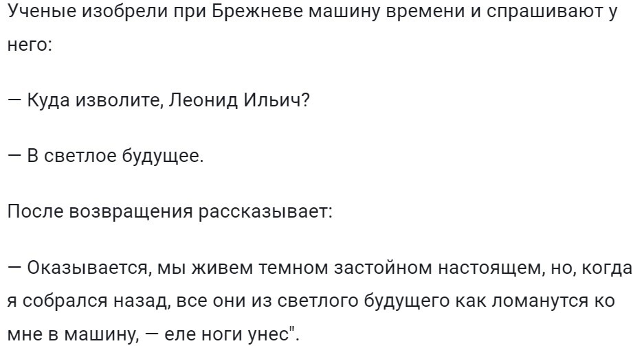 1430 PlyusMinus Юмор Вперед в прошлое))1 11 месяцев назад . Юмор СССР Леонид Брежнев Машина времени Картинка с текстом Анекдот 67 16 14 11 Ещё 0