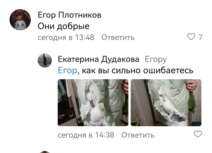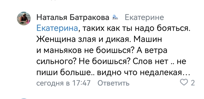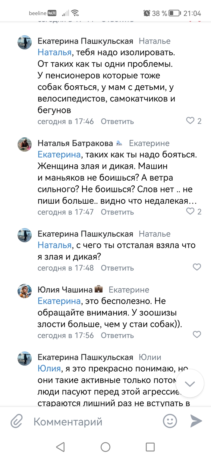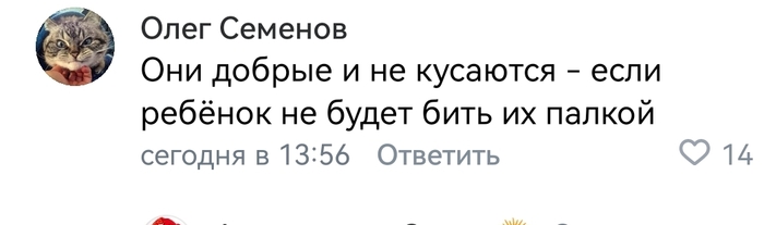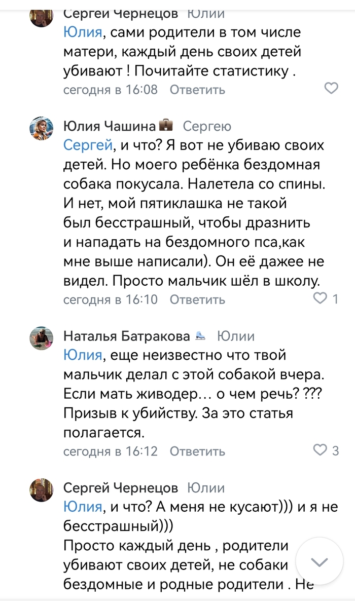 Прочитав пост, написала, как на моего пятиклассника напала собака со спины. Тот псину даже на видел.. В итоге оказывается, это мой сын спровоцировал, бил её палкой, кидал камни и тд. На вопрос, каким надо быть бесстрашным мальчиком, чтобы это проделывать со свободно гуляющей псиной, получила ответ, что раз я даю ссылку на петицию, то я живодерка, мой сын-живодер, мне прилетит карма и вообще мы мрази и твари.