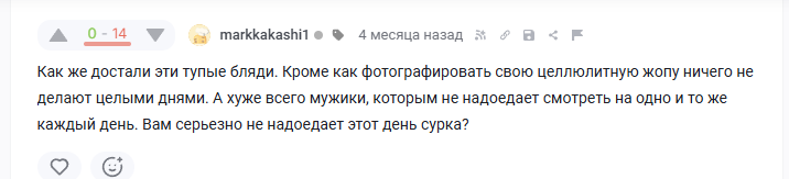 Молодец, а теперь почитай свои комментарии, скуфяра. Даже лень перелопачивать всю эту тонну говна, где ты в каждом комментарии экстраполируешь свои неудачные отношения с противоположным полом.