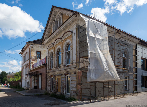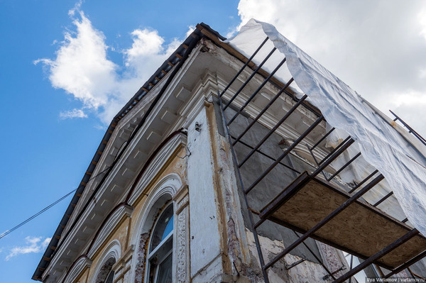 Половина здания уже обшита какой-то уёбищной плиткой, но другую решили "отреставрировать". Ну как – "отреставрировать"... Как умеют. Дом уже обзавелся новой модной крышей, новыми фасадами и окнами, никакой ценности он уже не представляет.