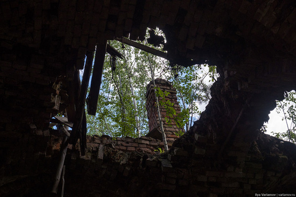 Пишут, что какой-то проём архитектор в XIX веке предусмотрел для колокольни, но этих "проёмов" тут слишком много. На крыше выросли деревья, и скоро здание окончательно поглотит природа. Ещё одна страница истории, которая оказалась никому не нужна.