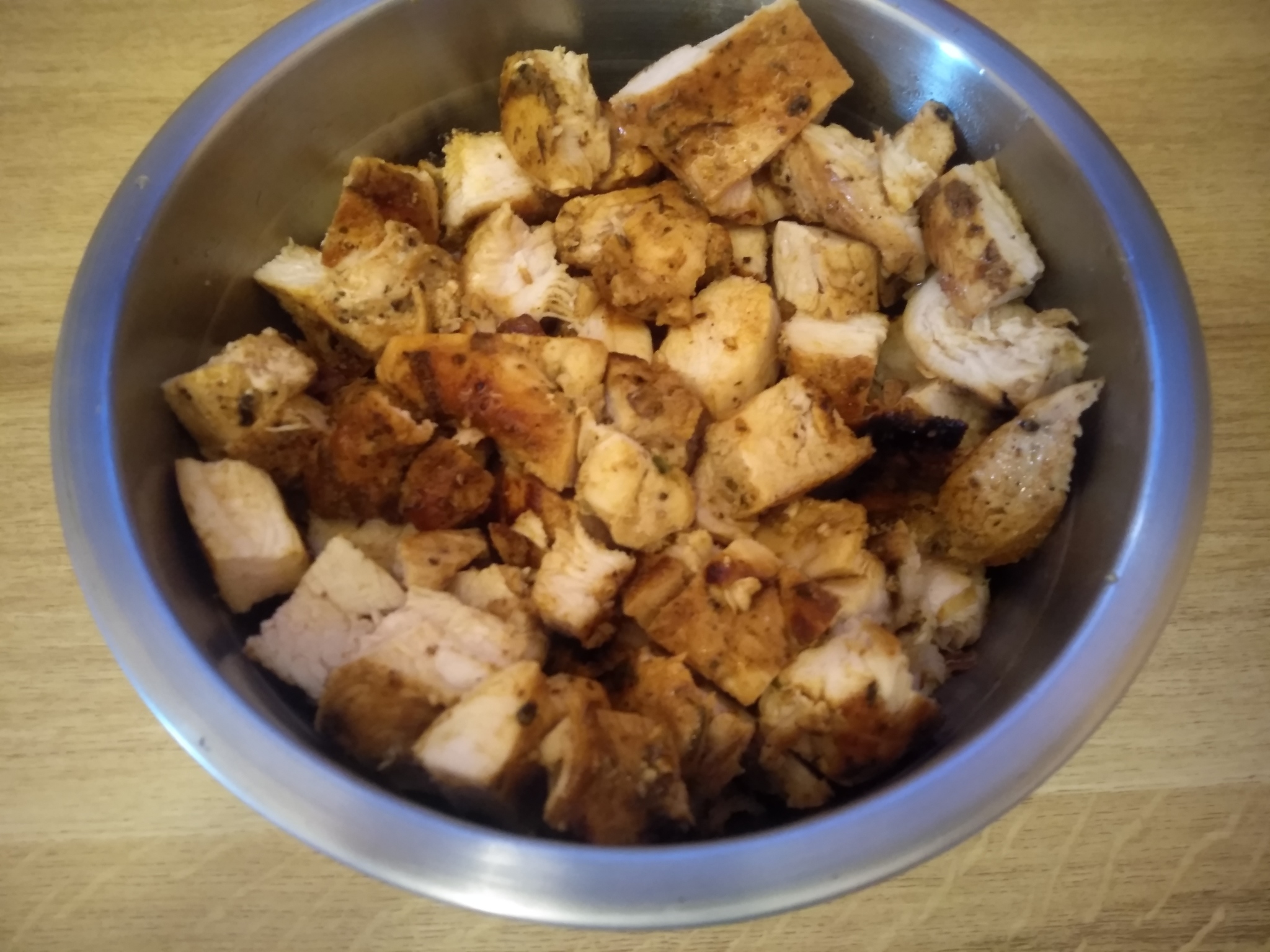 Курицу натрите сухими специями (rub), пожарьте на сковороде или запеките в духовке. Нарежьте кубиками.