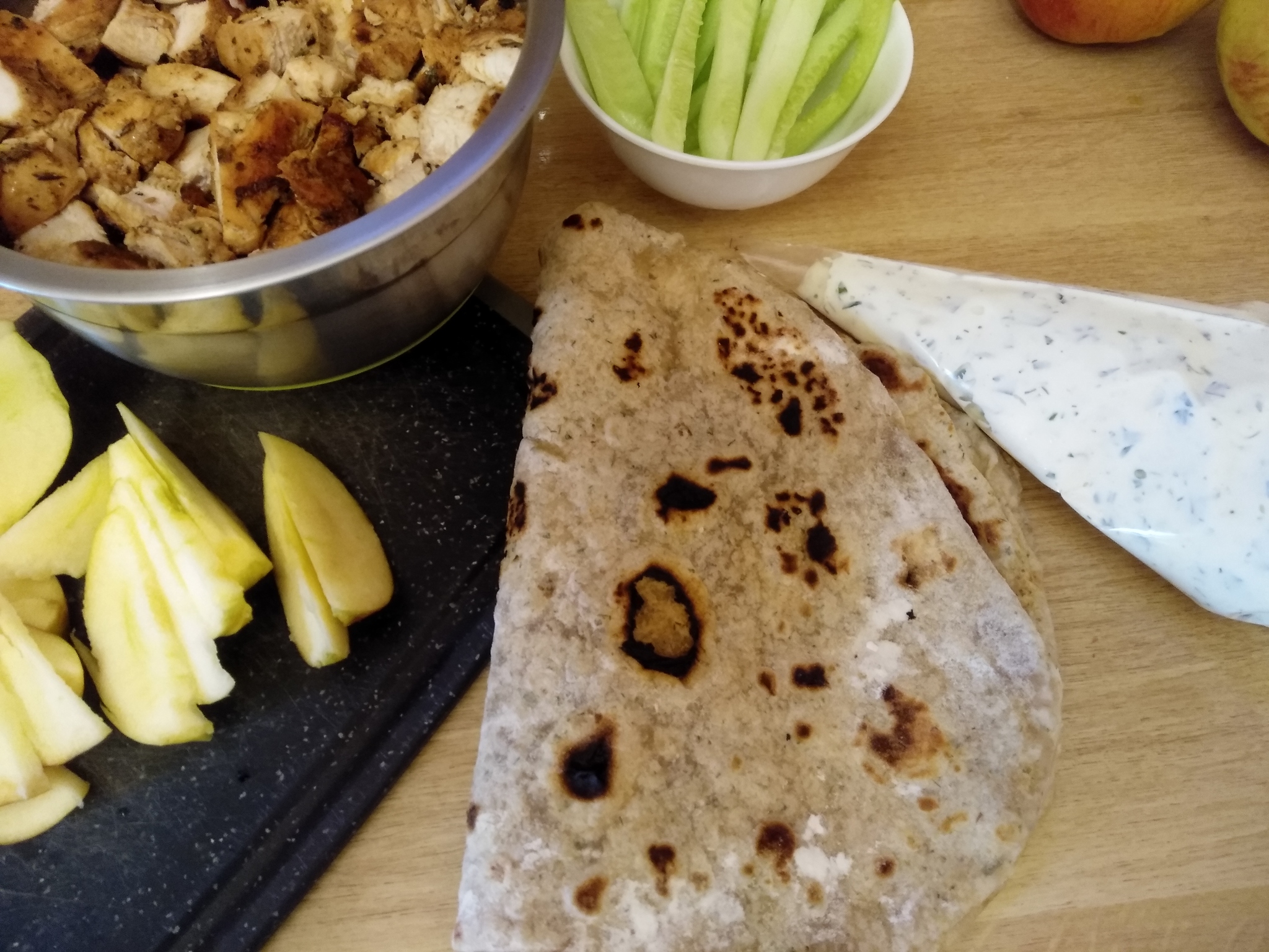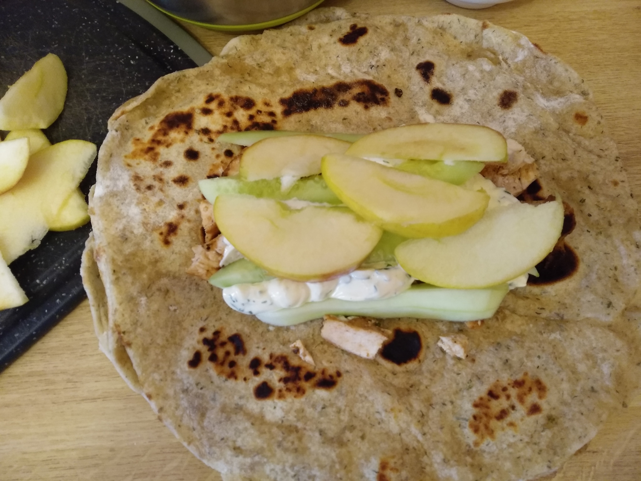 На лепешку выложите курицу, соус "ранч", огурцы и яблоки. Сверните как буррито.