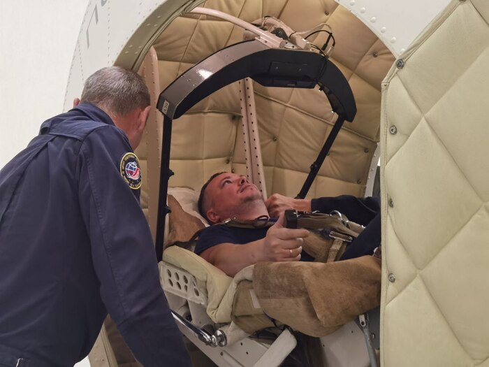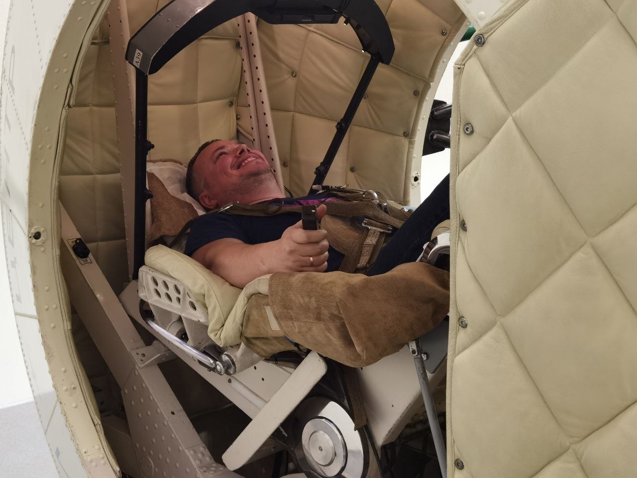 Когда наступает твоя очередь, ты идешь в зал с центрифугой и надеваешь на обувь тканевые бахилы. Во время остановки кабина центрифуги стоит вертикально, «на ребре», и ты под контролем техников по приставным ступенькам забираешься внутрь. Техники четко, с двух сторон кабины контролируют процесс, подсказывают как залезать, чтобы не удариться головой. Ложишься в кресло и терпеливо ждешь пока твой «хвост» датчиков подключат к системе, затем получаешь дополнительной клипсы датчиков на мочку левого уха и палец, также на левую руку надевают манжету измерения давления.