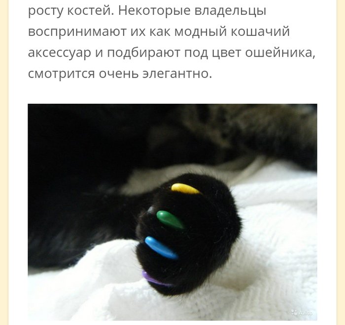 а) Клей, на который крепятся колпачки, может вызвать аллергическую реакцию у любого животного.б) Заметили, как странно выглядят коготки? Это потому что кошка не может до конца втянуть их, то есть они находятся в постоянно вытянутом положении (см. второе фото). Это атифизиологично.