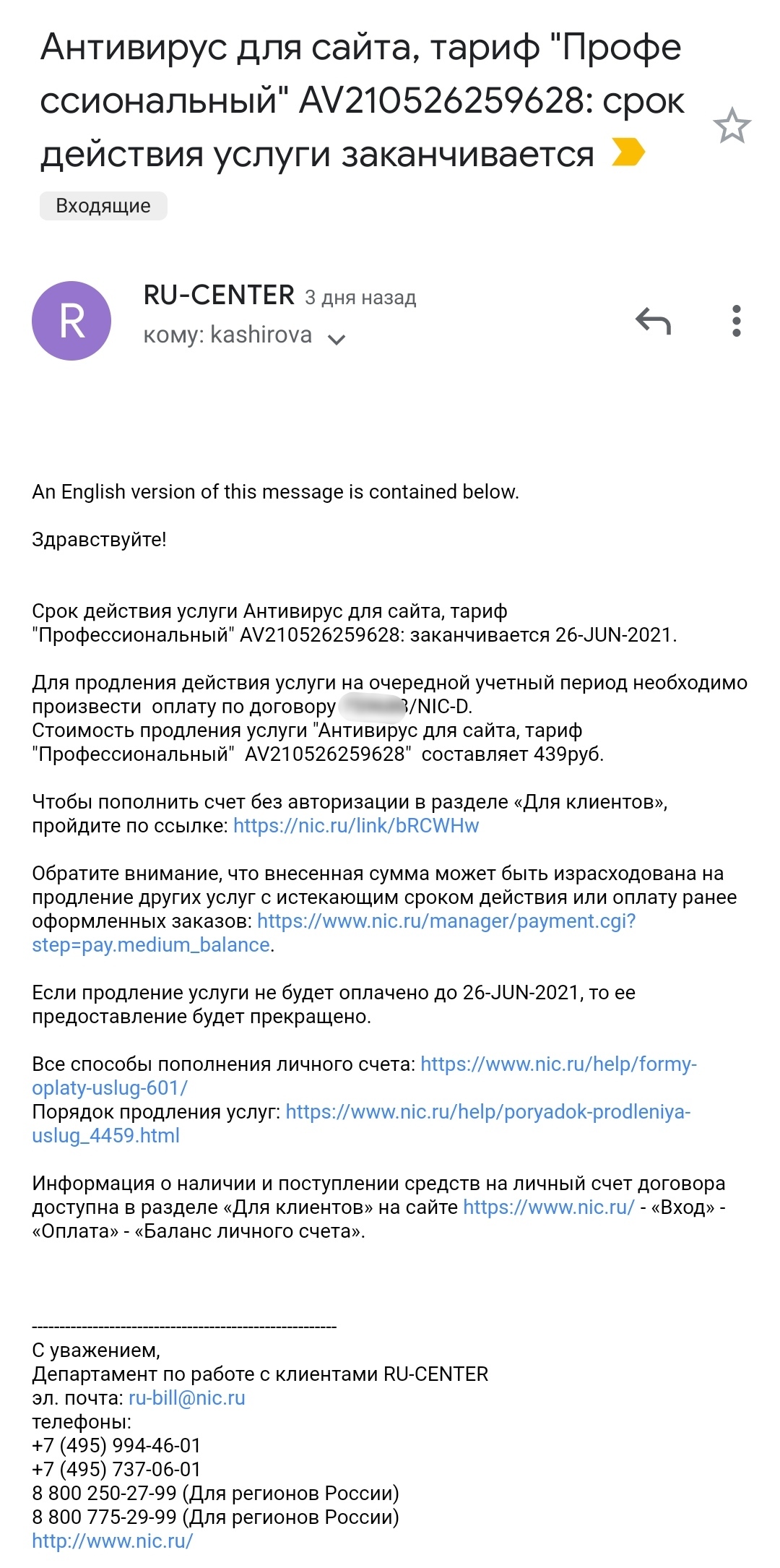 Я зашла в личный кабинет, не нашла никаких услуг, требовавших продления, заглянула в почту. Нашла там письмо от 6 утра того же дня, предупреждающее о необходимости оплаты.