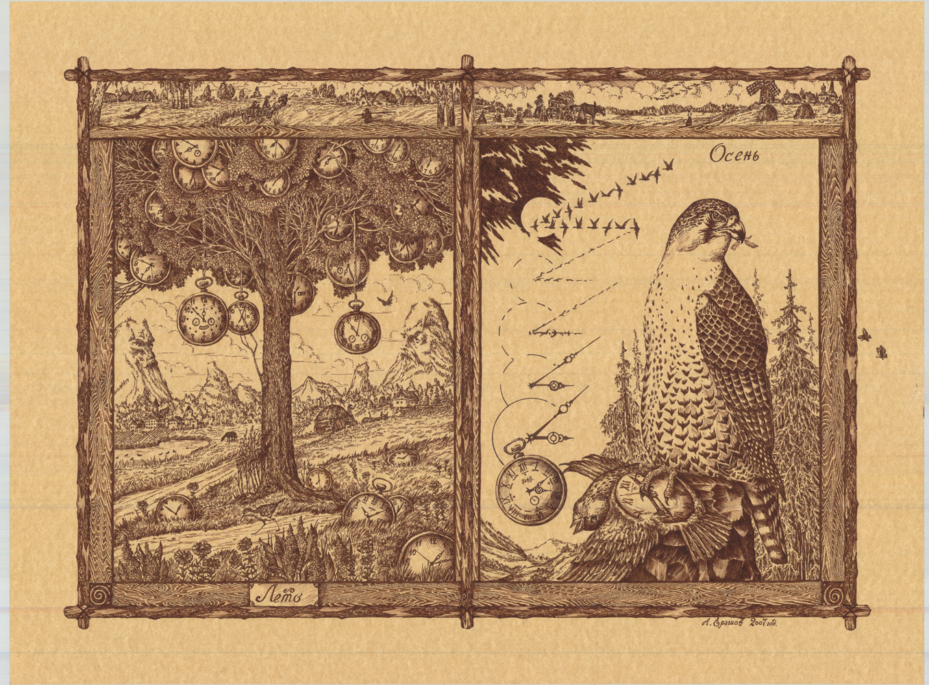 "Лето-осень" правая часть диптиха "Время". Тонированная бумага, орешковые чернила, изограф, 600х800мм. 2007 год.