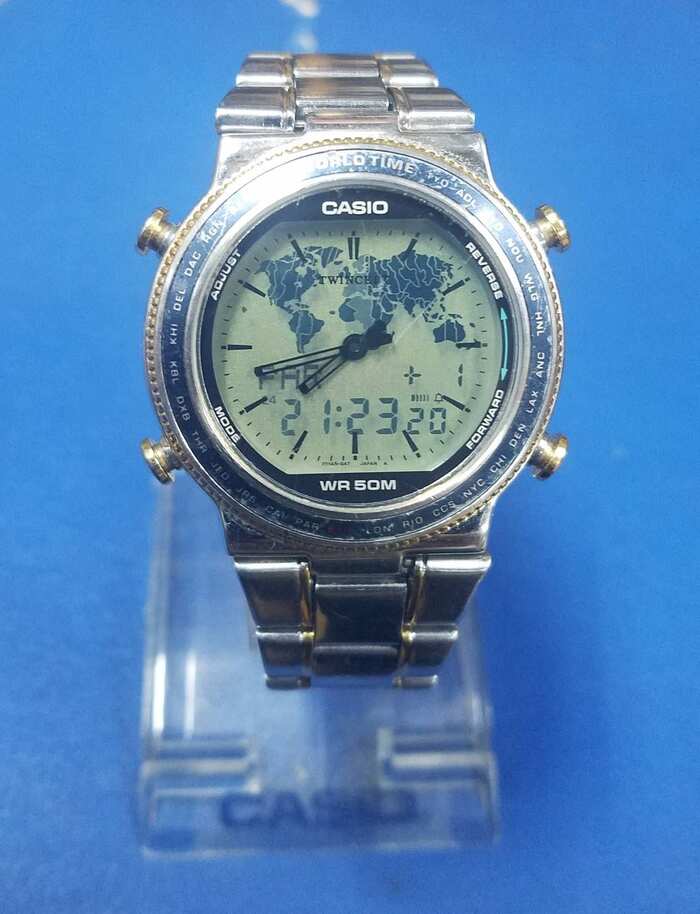 Кварцевая классика с электронной версией на стекле. Ещё и карта мира перемигивала материками.
