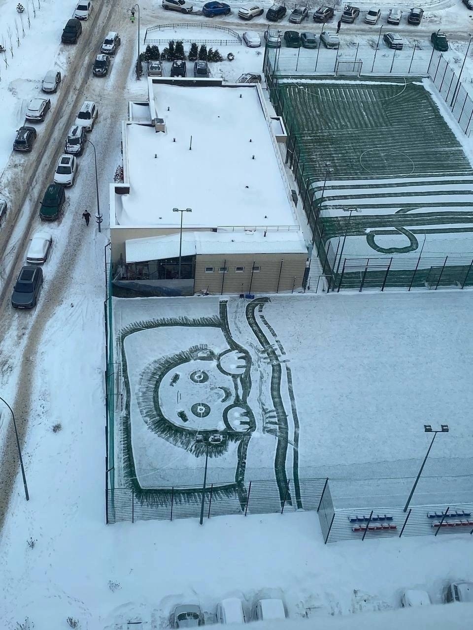 Завершить материал хочу историей Максима Печенкина из Нижнего Новгорода, который стал звездой социальных сетей. Он следит за состоянием футбольного поля, где этой зимой он решил сделать несколько рисунков. Его помощь - это подарить всем нам улыбки.