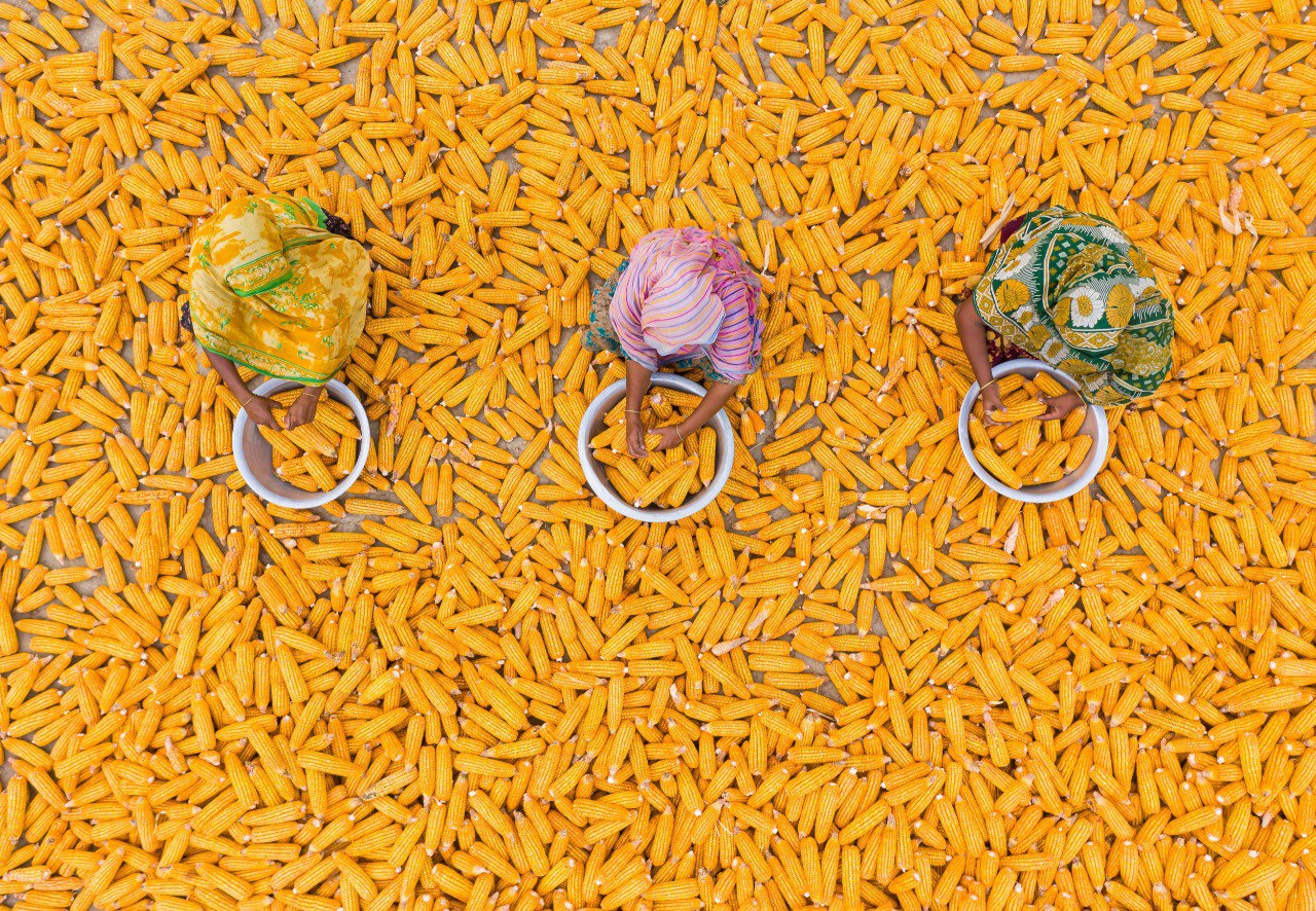 Бангладеш, округ Богра. Фотограф при помощи дрона запечатлел процесс сбора кукурузы. Ежедневно сборщики вручную очищают початки, складывая зерна в специальные ёмкости для просушки.