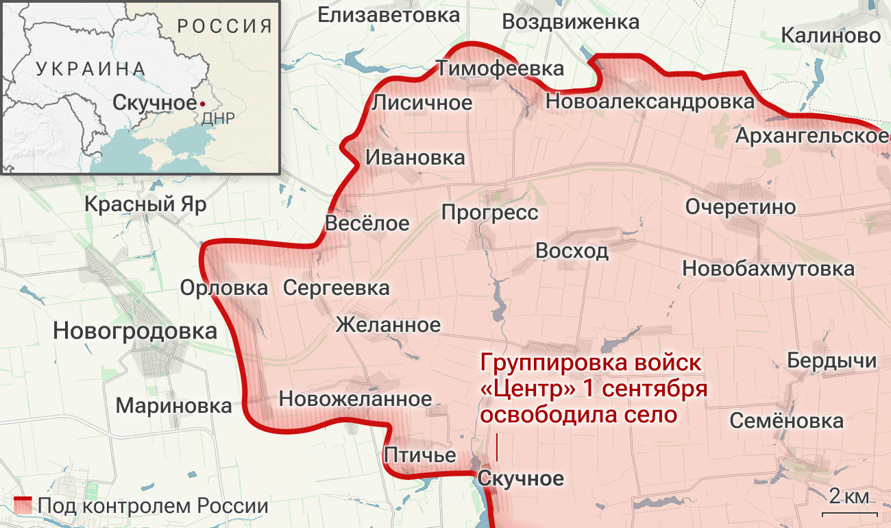 Скучное (Покровское направление) — небольшое село, расположенное на восточном берегу реки Волчья. Первые сообщения, что российским войскам удалось его занять, появились еще в 20-х числах августа, но теперь эта информация подтвердилась официально. Контроль над ним позволяет упростить логистику для частей, наступающих на Покровском направлении.