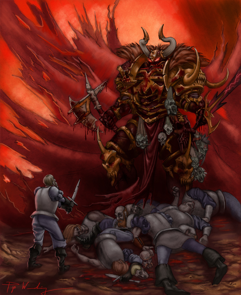 Красные латы, меч побольше, рога, шипы. Мускулистый, саблезубый конь.