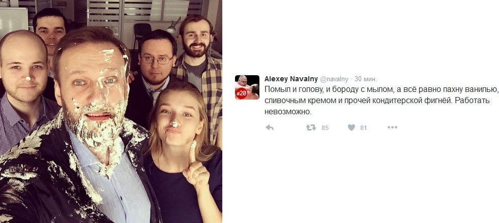 В Алексея Навального бросили два торта у офиса Фонда борьбы с коррупцией.
