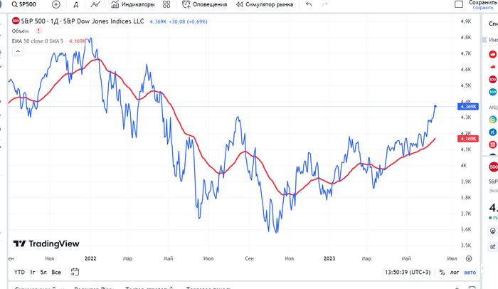 Если вы когда-нибудь смотрели на биржевые графики, то видели, что там идет подробная линия цены, которая реагирует на мельчайшие изменения на рынке. Но чтобы чуть лучше понимать что происходит, возможно нет смысла смотреть каждое движение цены? Может, чтобы уловить общую тенденцию нам лучше подойдет какое-то среднее значение? Именно для этого и применяется экспоненциальная скользящая средняя (ema, exponential movement average) - на графике она красная.