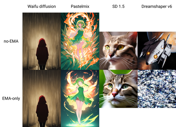 Но, если все так интересно, какая нужна нам? Зависит от модели, но как правило можно принять так: для тренированных оставляем ema/no-ema (тестируем какая будет лучше), для миксов оставляем no-ema.