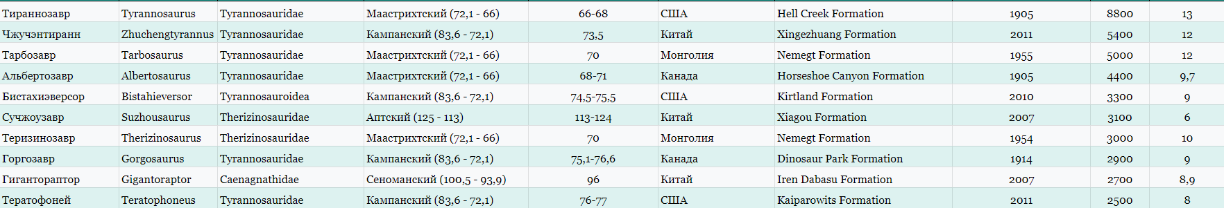 Тираннозавроиды (несколько семейств, включающие в себя тираннозавров, процератозавров и пр) хорошенько так повлияли на средний вес всех динозавров в таблице. Если в первом посте средний вес ящеров составлял 35 кг, во втором посте он вырос до 160 кг, то сейчас средний динозавр весит 462 кг. Такие процератозавриды, как юйтиранн и синотиранн весят более тонны, а уж тираннозавриды (тираннозавр, тарбозавр и чжучэнтиранн) имеют массу более 5 тонн. Средний вес тираннозавров составил более 3 тонн.