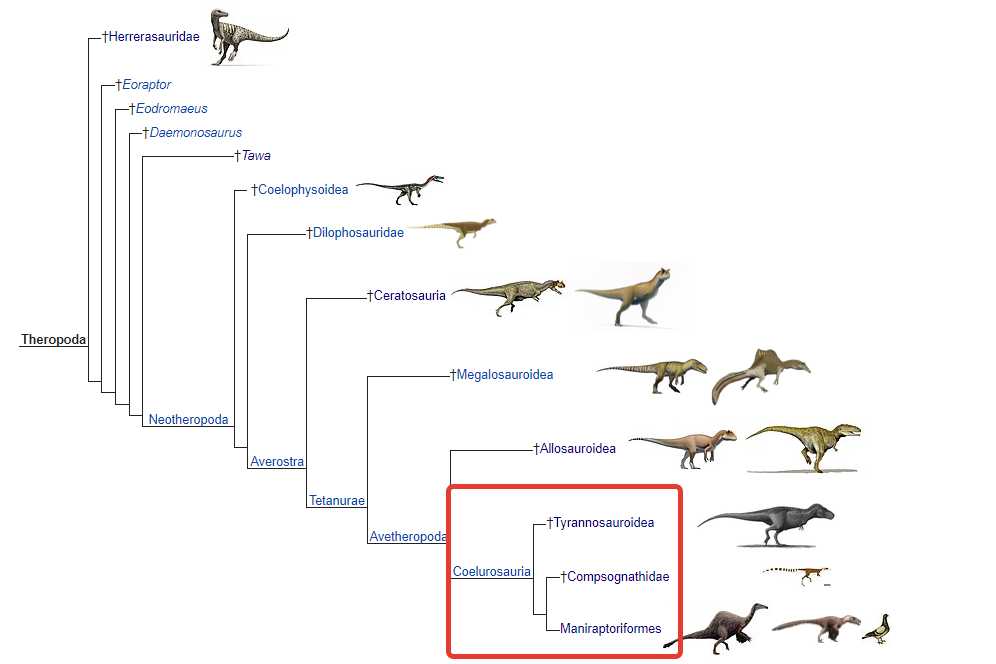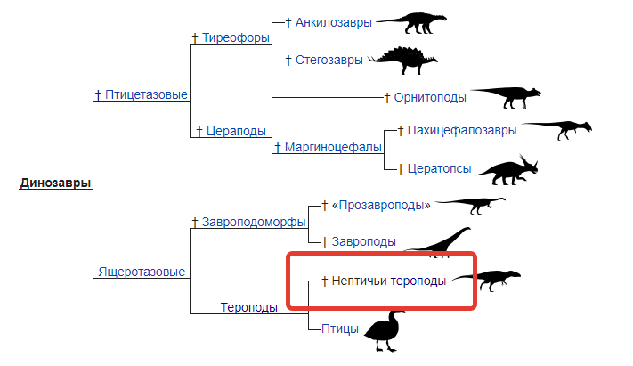 Посмотрим, сколько я внёс динозавров за 3 дня работы. Я внёс почти всех целурозавров: компсогнатидов, тиранозавроидов и манирапторов. Как это выглядит в масштабе всех динозавров?