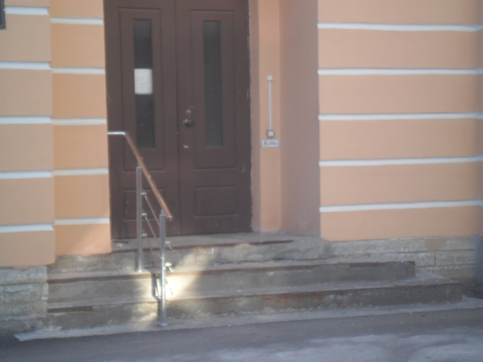На входе в столовую установлен звонок для тех кто передвигается на коляске, видимо кто-то выйдет и поможет заехать во внутрь, т.е. человек заезжает по ступенькам на коляске, нажимает на звонок, спускается со ступенек, потому что дверь открывается наружу!!! И ждет когда кто-нибудь выйдет и поможет снова подняться по ступенькам. Все для людей!