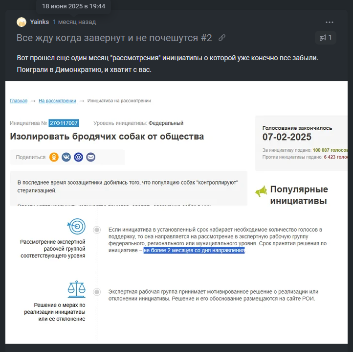И еще один месяц "рассмотрения" петиции по отлову собак, которую тащили всем селом Пикабу. Это вам не VPN запрещать.