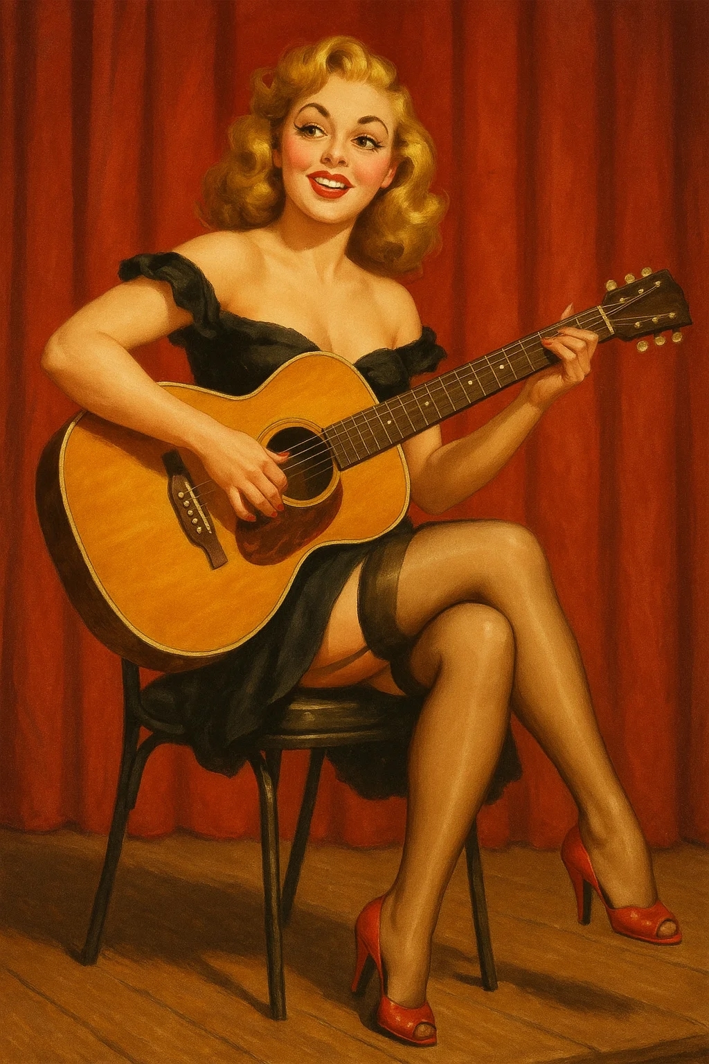 Девушка сидела на обычном деревянном старом стуле в центре сцены. Между её широко расставленных ног на стуле стояла гитара. Девушка была полностью обнажена. Даже обуви на её ногах не было. И головного убора тоже не было. На голове, конечно же.