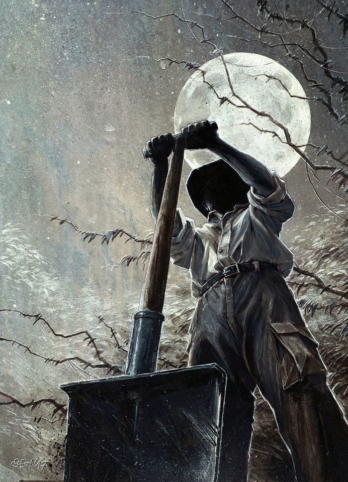 К первым могилам, которые он вырыл с утра, начали стекаться люди. Вот в одни ямы полетели музыкальные инструменты, в другие — фотографии дальних стран, в третьи — картины, которым никогда не суждено было быть написанными, в четвёртые — халаты ученых, которые никогда не будут надеты. Возле детской могилы стоял мальчик с мокрыми от слёз глазами. Рядом с ним стоял отец и крепко сжимал его плечо.