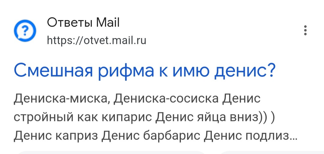 DVMD Всем Денисам - привет! 7 месяцев назад Хотел я друга с Днём рождения поздравить в стихотворной форме и не придумал ничего умнее чем обратиться к интернету. На мой запрос интернет выдал следующее: Собственно это я ему и отправил... [моё] Интернет Грамматические ошибки Денис Скриншот Ещё 0