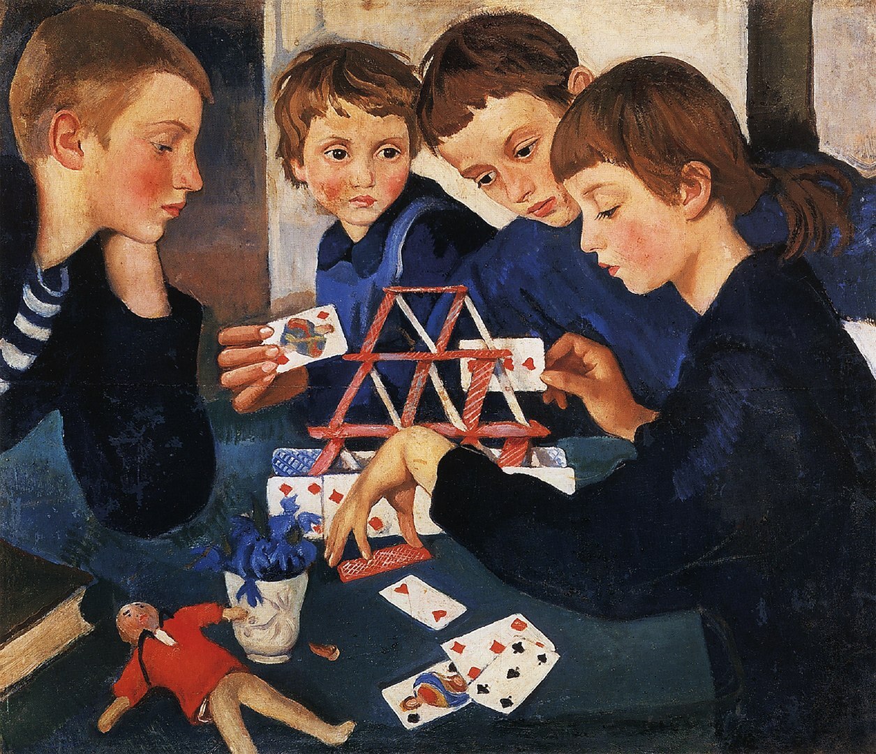 В «Карточном домике» дети в одежде синего цвета (разных оттенков), сидят, прижавшись друг к другу, у покрытого тёмной скатертью стола и строят из игральных карт хрупкий домик. Они сосредоточены, одновременно ожидают и боятся крушения постройки.